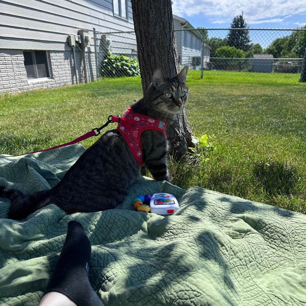 Pepsi got to come out with us found thr only sunny spot on the blanket like the queen she is. We all lounged in the shade of the tree in our tiny backyard, which honestly feels like it gives us a gentle hug. Alice surprised us and ventured off the blanket and into the grass, little brave feet in the green!