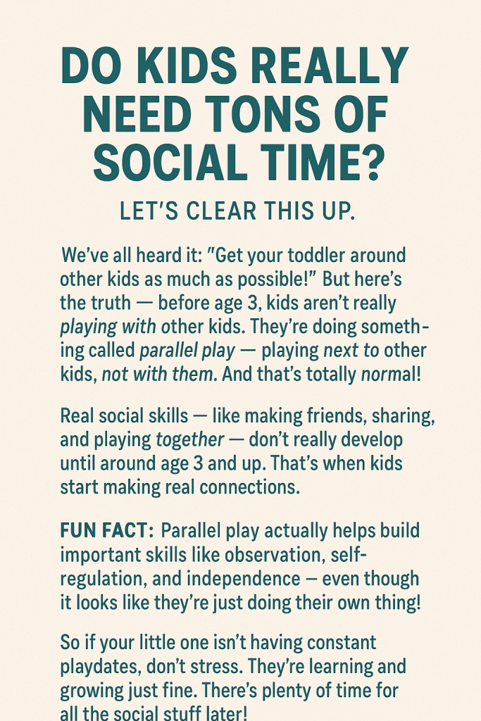 We’ve all heard it: “Get your toddler around other kids as much as possible!” But here’s the truth — before age 3, kids aren’t really playing with other kids. They’re doing something called parallel play — playing next to other kids, not with them. And that’s totally normal!