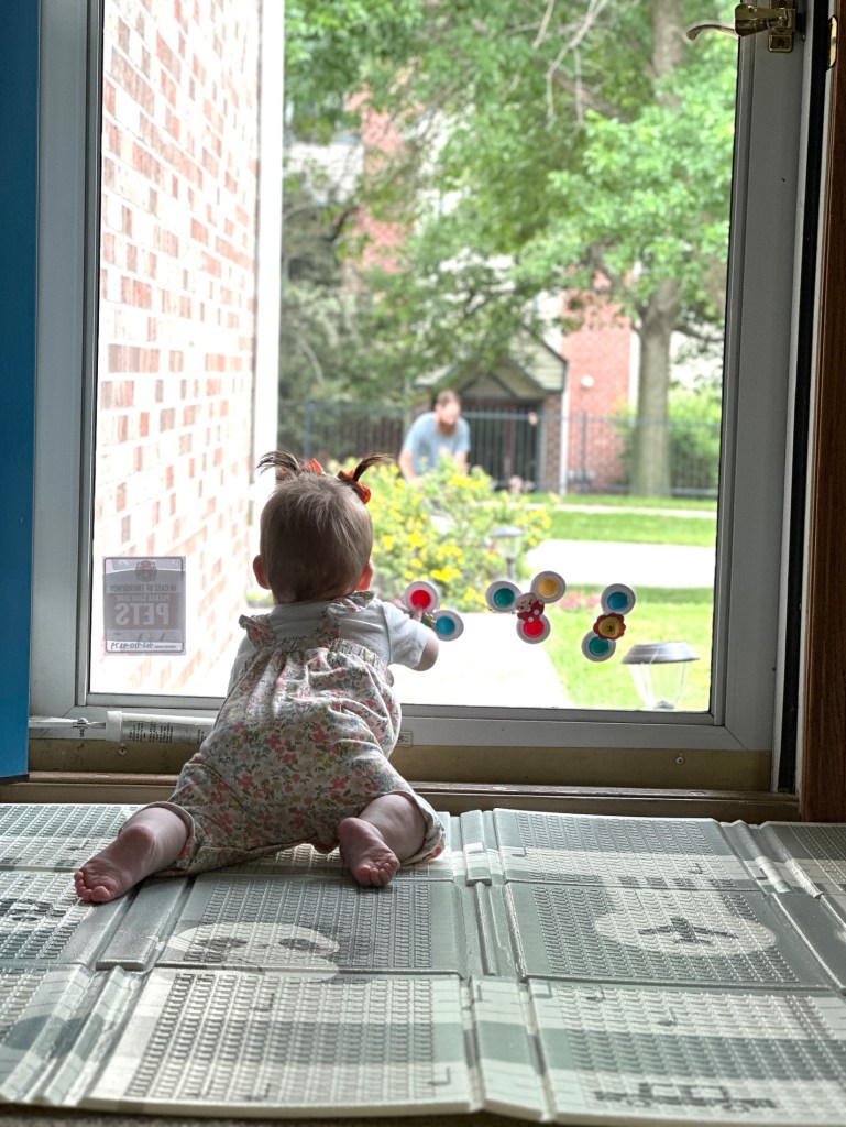 She spotted her dad mowing the yard and beelined straight for the all-glass door. Crawling as fast as her little legs could carry her, she pressed her tiny hands against the glass just to watch him. Spinners didn’t stand a chance that day.