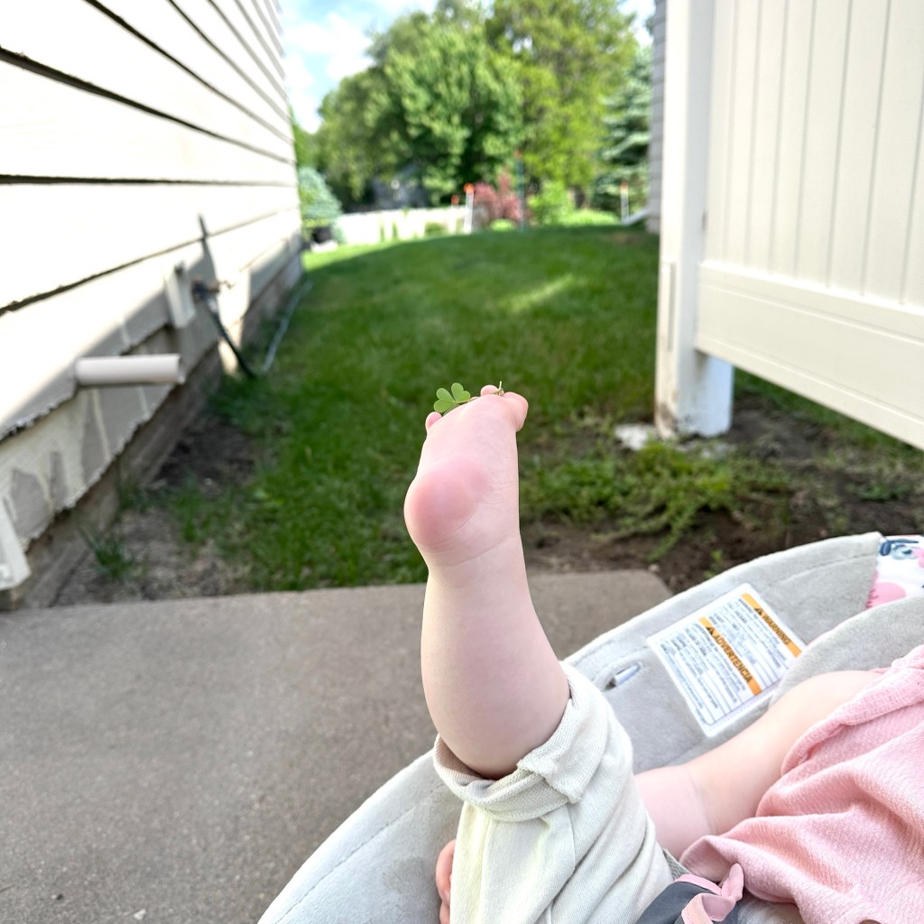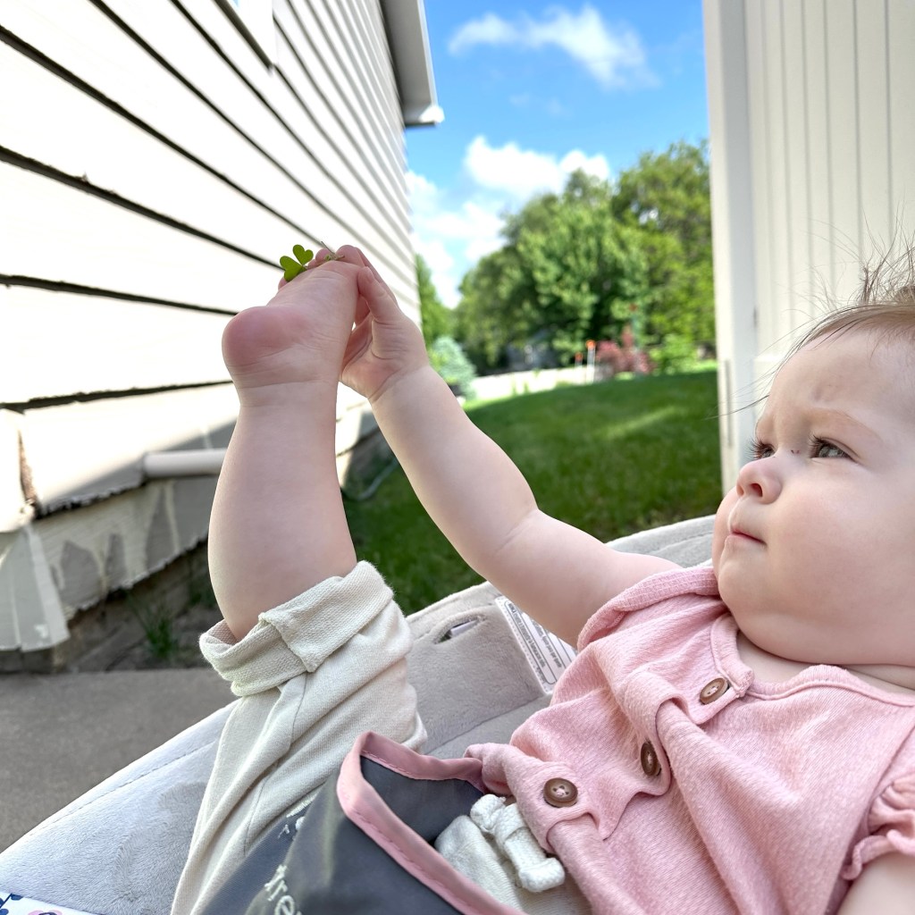 Stop and smell the flowers, right nugget? Or at least let me tuck them between your toes for a second as I watch the determination on your face getting that clover out!
