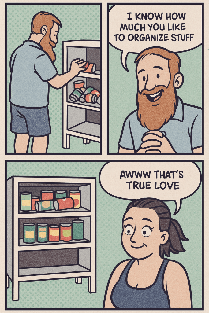 My husband loves me so much that he shows it in the most unexpected ways. Like shoving all the canned goods into our cabinet for me to sort later.