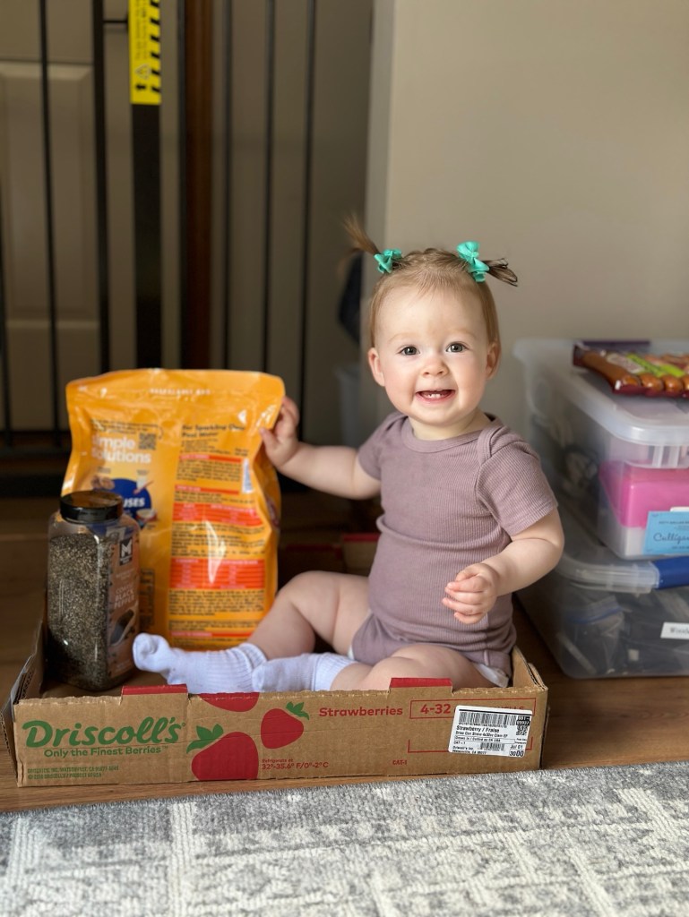 Brett brought home our Sam’s Club pickup… but clearly, the real delivery was this goofball who climbed into the strawberry box like she was the newest item on the order list.