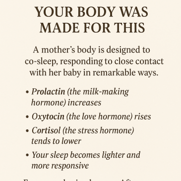 Let’s talk about co-sleeping — something that’s been practiced for centuries and is still a natural, instinctive choice for many parents today. What’s really amazing? A mother’s body is literally designed to co-sleep. When you sleep close to your baby, your body responds in incredible ways: Prolactin (the milk-making hormone) increases, supporting breastfeeding through the … More The Truth About Co-Sleeping: Your Body Was Made for This